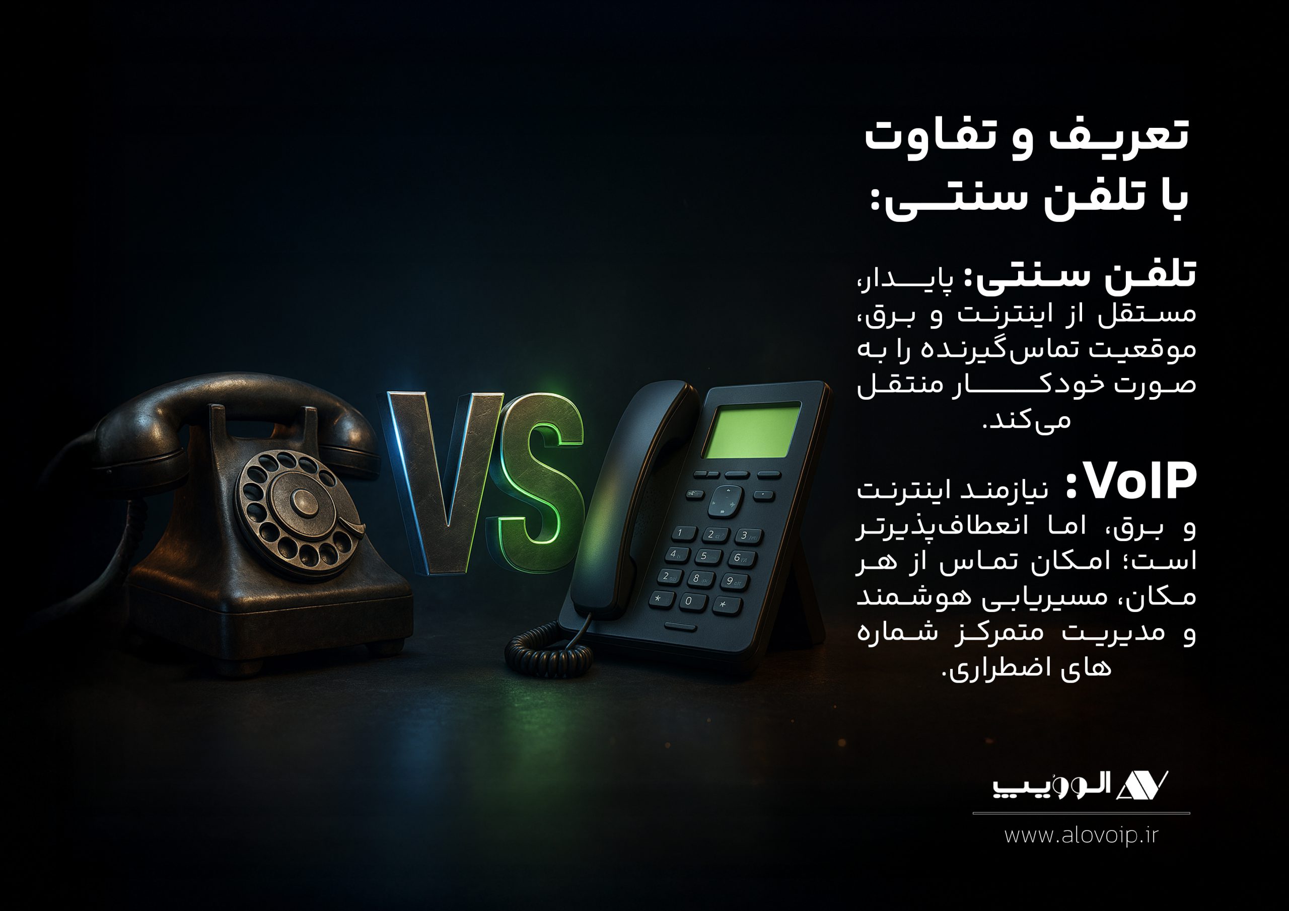 تلفن سنتی مستقل از اینترنت و برق است، اما VoIP انعطافپذیری بیشتری دارد و امکان مدیریت چند شماره و یکپارچگی با سیستمهای داخلی را فراهم میسازد.