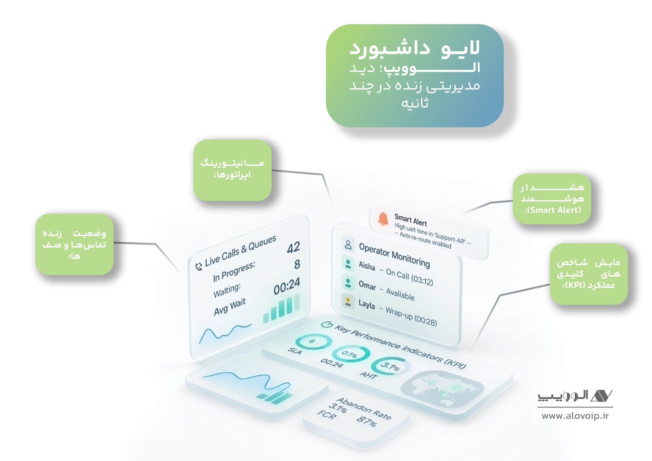 لایو داشبورد یا داشبورد زنده، صفحهای بصری و تحلیلی است که اطلاعات حیاتی مرکز تماس را بهصورت بلادرنگ نمایش میدهد. این داشبورد با اتصال مستقیم به سرور VoIP و CRM سازمان، دادهها را در همان لحظه بهروزرسانی میکند.